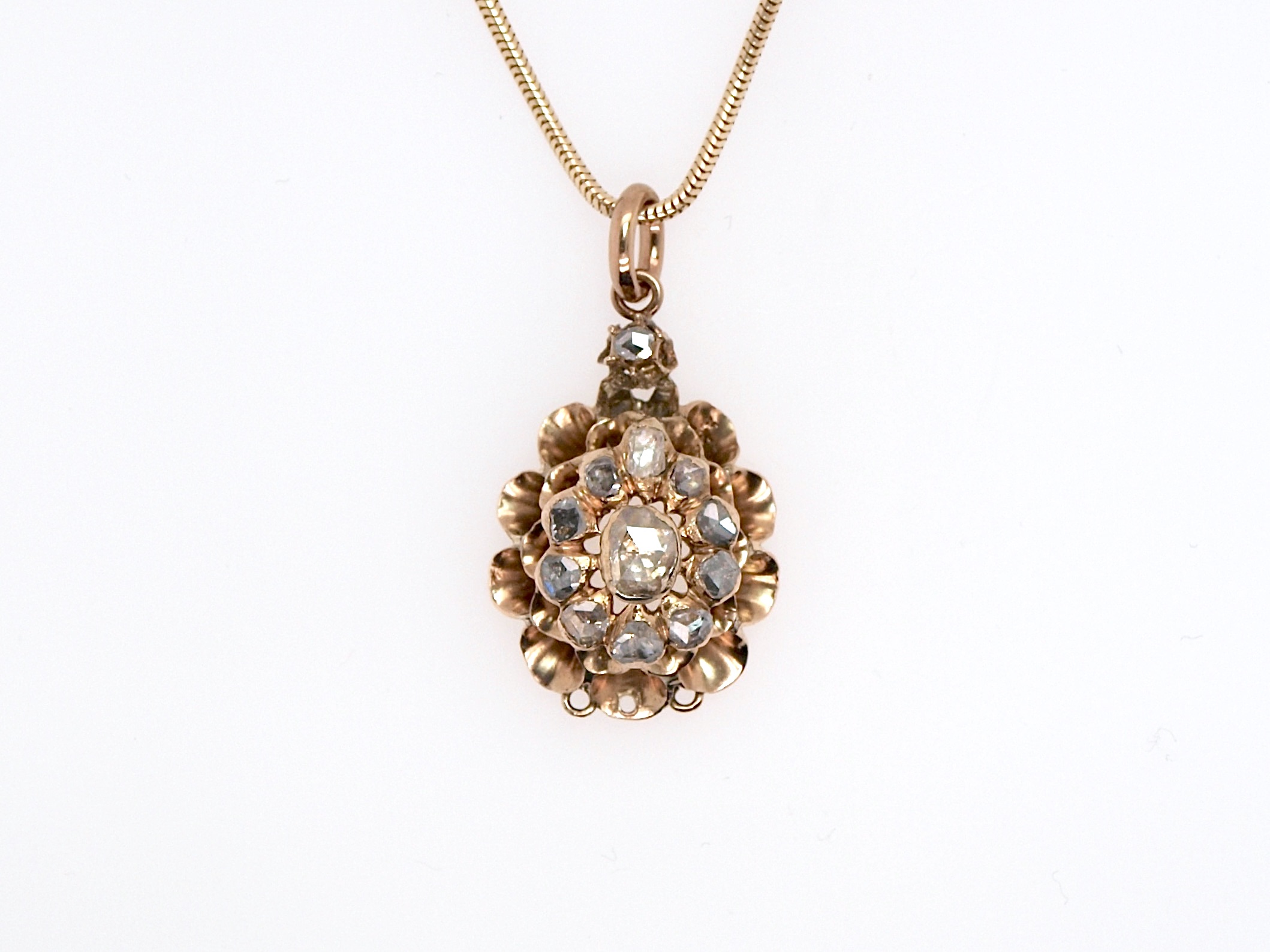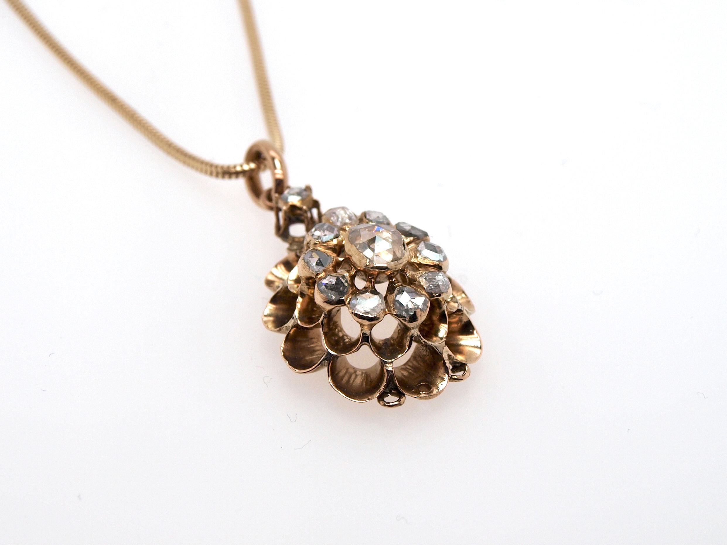 Dieser fein gearbeitete Anhänger aus 14-karätigem Rotgold zeigt eine plastisch ausgearbeitete Blütenkomposition, wie sie für die zweite Hälfte des 19. Jahrhunderts charakteristisch ist. Im Zentrum und in konzentrischer Anordnung sind a-jour gefasste Rosendiamanten verarbeitet, deren Gesamtgewicht sich auf etwa 1,0 Karat beläuft.