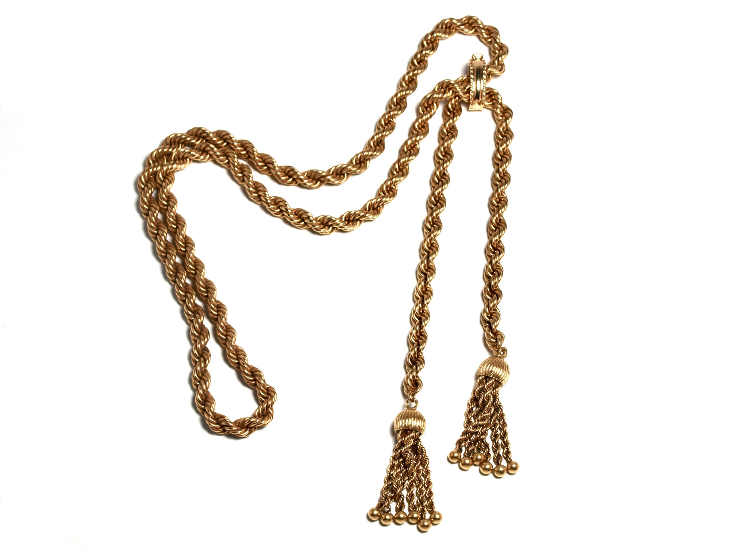 Solche Kordelketten mit Quasten gehören zu den ikonischen Schmuckformen des 20. Jahrhunderts. Vergleichbare Stücke wurden von Stilikonen wie der Herzogin von Windsor getragen. Bekannt ist, dass sie ähnliche, bewusst reduzierte Goldketten mit Quasten schätzte und trug. Sie stehen für einen souveränen, modernen Luxus, der weniger über Edelsteine als über Material, Gewicht und Formensprache wirkt.