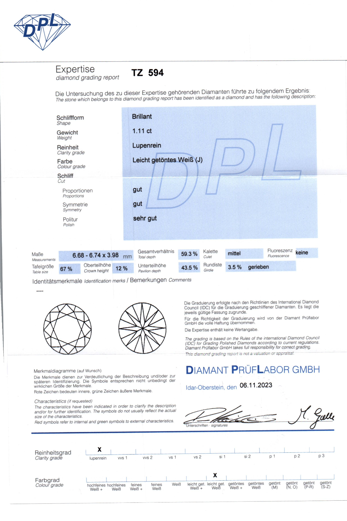 Material: Platin (950/000), getestet; Diamant im Brillantschliff, 1,11ct, lupenrein, leicht getöntes Weiß (J), keine Fluoreszenz, DPL-Zertifikat vom 06.11.2023.