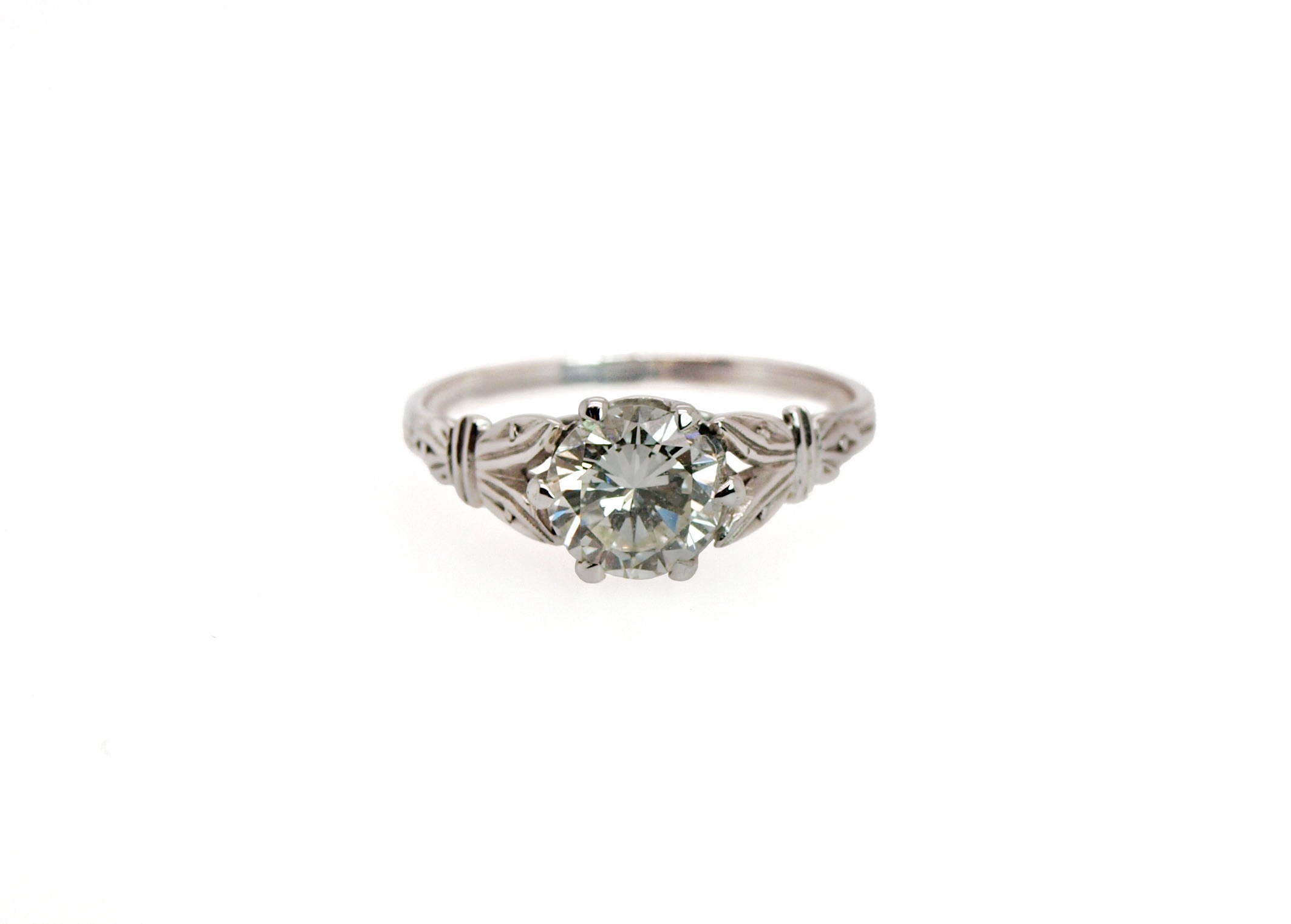 Die Platinringschiene ist kunstvoll gearbeitet: durchbrochene Blattornamente, inspiriert vom Art Déco und dem floralen Jugendstil, verleihen dem Ring romantische Anmut und einen Hauch Vintage-Charme. Trotz der feinen Details bleibt die Formensprache klar und ausgewogen – ein harmonisches Spiel zwischen Struktur und Reduktion, zwischen Klassik und Moderne.